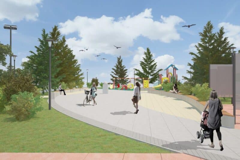 U parku su izvedene šetne staze u štampanom betonu, sa podnom rasvetom, napravljene su klupe, stolovi za šah, galerija na otvorenom, kao i centralni skver sa česmom.